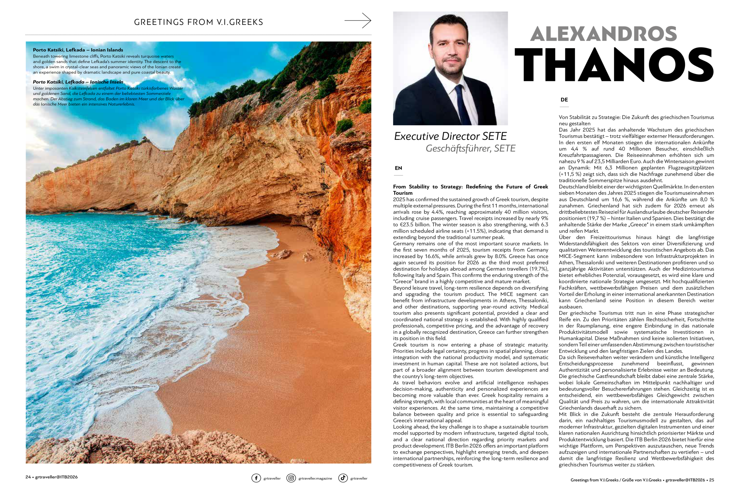 Παράλληλα, με στόχο τη διαφοροποίηση του τουριστικού προϊόντος, τομείς όπως ο συνεδριακός και ο ιατρικός τουρισμός αναδεικνύονται σε στρατηγικούς πυλώνες ανάπτυξης: επεκτείνουν τη ζήτηση πέρα από τους μήνες αιχμής, επιβραβεύουν την ποιότητα και βασίζονται στη συνέπεια, την ασφάλεια και σε αξιόπιστα δίκτυα συνεργασίας. Εκτιμούμε ιδιαίτερα τον διάλογο και τις συνεργασίες που ξεκινούν στο πλαίσιο της ITB και ευθυγραμμιζόμαστε με τη θεματική της διοργάνωσης «Leading Tourism into Balance», ως τη σωστή προσέγγιση για βιώσιμη και ανθεκτική ανάπτυξη σε όλους τους τομείς του τουρισμού.