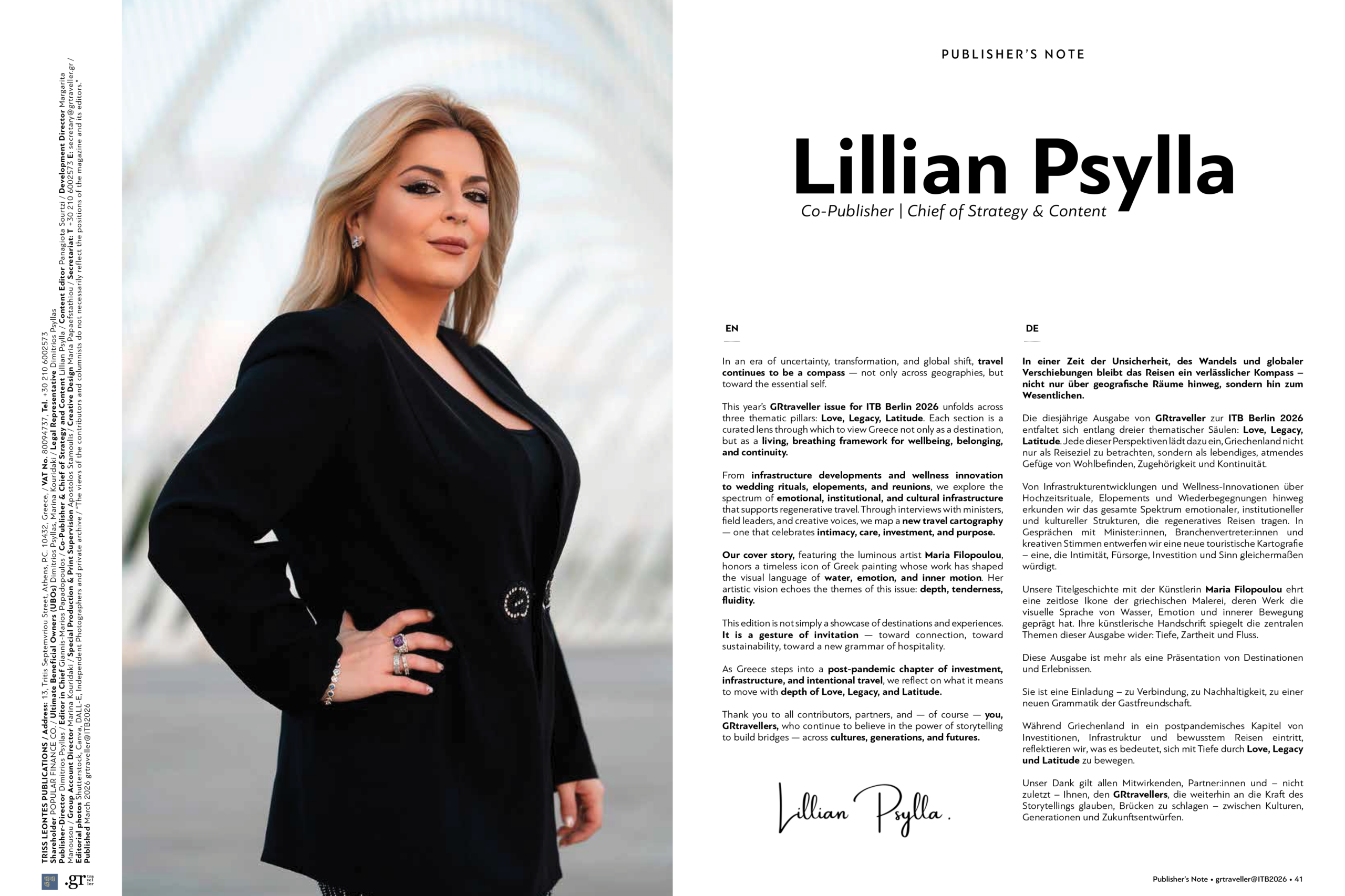 This year’s GRtraveller issue for ITB Berlin 2026 unfolds across three thematic pillars: Love, Legacy, Latitude. Each section is a curated lens through which to view Greece not only as a destination, but as a living, breathing framework for wellbeing, belonging, and continuity.