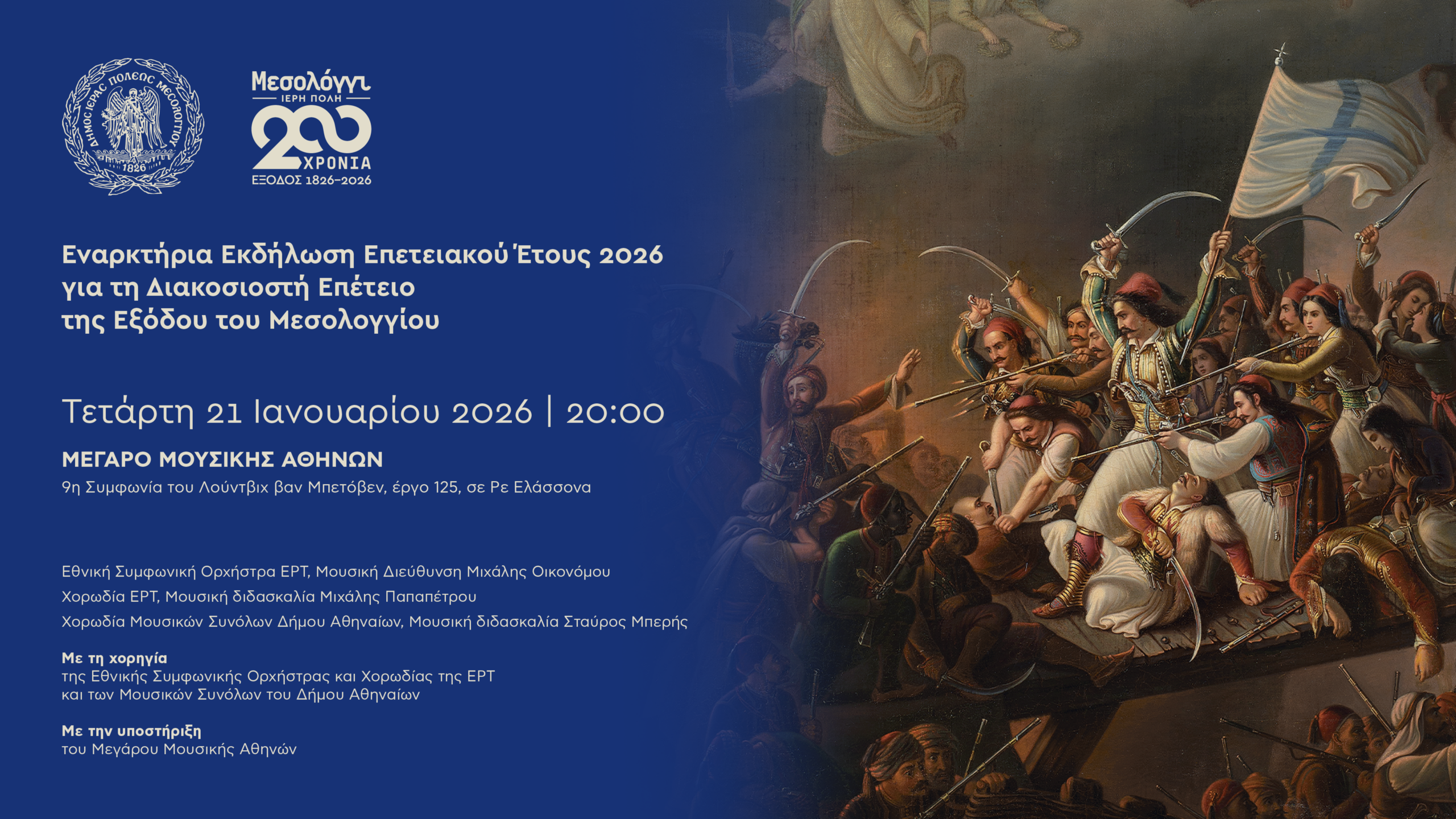 Η εναρκτήρια εκδήλωση θα πραγματοποιηθεί την Τετάρτη 21 Ιανουαρίου 2026 και ώρα 20:00,στο Μέγαρο Μουσικής Αθηνών, στην Αίθουσα «Αλεξάνδρα Τριάντη», σηματοδοτώντας την επίσημη έναρξη του επετειακού προγράμματος που διοργανώνει ο Δήμος Ιεράς Πόλεως Μεσολογγίου για τη Διακοσιοστή Επέτειο της Εξόδου.